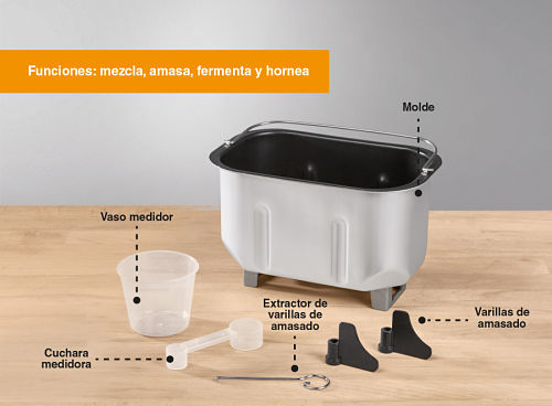 Los accesorios de la panificadora Lidl, aquellos con los que te la vas a llevar a casa y que te van a ayudar a preparar tus recetas de una forma sencilla, son: un vaso medidor y una cuchara medidora, el gancho para retirar cómodamente la varilla amasadora, el libro de instrucciones y un libro de recetas.